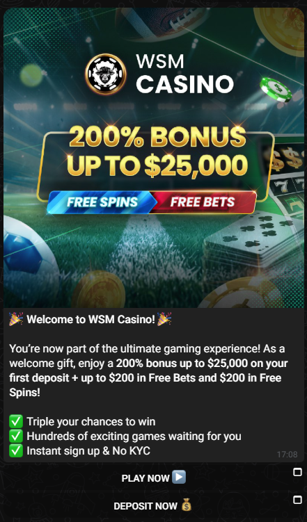 WSM Casino to stosunkowo nowa platforma hazardowa online, która szybko zyskała popularność dzięki połączeniu kasyna kryptowalutowego z elementami społeczności Wall Street Memes. Serwis działa w pełni online i obsługuje dziesiątki kryptowalut, w tym Bitcoin, Ethereum, Dogecoin czy Litecoin. Minimalny depozyt to 10 USD, a transakcje są realizowane błyskawicznie – zarówno przy wpłatach, jak i wypłatach, które zwykle trafiają na konto gracza w ciągu 24 godzin.